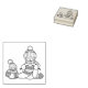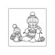 Cute cartoon illustration of two snowmen dressed in knitted hats and scarves. The big snowman is knitting an oversized scarf for the little one. The scarf is already wrapped several times around the cute little snowman.