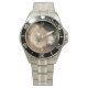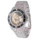 Has heft and feel of expensive stainless steel quartz watches. Good band with safety catch. I removed links, which is easy because engraved arrows show direction to push the linking pins. As always by this seller, the image (a railroad logo) is a perfect reproduction of my emailed image, and is precisely spaced and aligned.