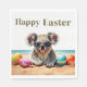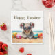 Koala wearing glasses relaxing on a sandy beach with colourful easter eggs