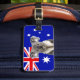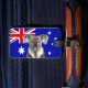 This furry koala is a native of Australia. The Australian flag is in the background. They are easily recognisable by their stout, tailless body and large head with round, fluffy ears and large, spoon-shaped nose.