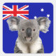 This furry koala is a native of Australia. The Australian flag is in the background. They are easily recognisable by their stout, tailless body and large head with round, fluffy ears and large, spoon-shaped nose.