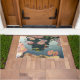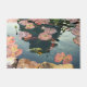The koi fish swimming contrast with the dark green leaves below the surface of the water in the lily pond. The colourful lily pads and stone rocks add to the colourful scene.