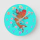 An orange oriental style koi fish, surrounded with pink flowers on a turquoise colored clock. Numbers are optional.