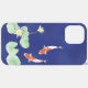 A blue iPhone 12 Pro Max case featuring an idyllic Zen watercolor painting of two koi in a pond with white water lilies and water lily pads .