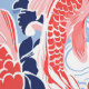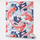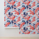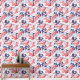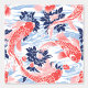 This seamless pattern features red-orange koi fish with delicate white outlines, elegantly swimming amidst dark blue floral elements in a serene pond depicted in white and light blue. Inspired by Japanese art, the design captures the tranquil beauty of a traditional koi pond scene, blending natural motifs with artistic grace.