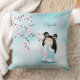 This cute throw pillow features a kokeshi doll in a turquoise and dusky pink kimono with cherry blossoms. Customise it with a name.