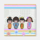 4 cute kokeshi dolls on classic Japanese background pattern.