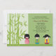 Adorable Japanese Kokeshi dolls invite you to tea to celebrate a little girl's birthday. The green background features bamboo foliage.
