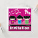 Cute invitation, your friends will love it! 3 kawaii japanese dolls (kokeshi) on a pink background with cherry flowers.