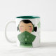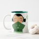 Kokeshi doll wearing a green kimono with star details on front and back. The middle has a star design.