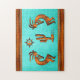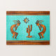 Enjoy this Unique Southwest Kokopelli Puzzle! It Features Two Copper Southwest Kokopelli Dancing and Playing the Flute around a Cactus Under the Sun on a Turquoise Background...Surrounded by a Copper Border!
