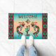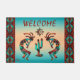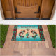 Personalise this Unique "One of a Kind" Southwest Kokopelli Doormat! It Features a Two Kokopelli Playing the Flute and Dancing Around a Cactus Under the Sun on a Turquoise and Orange Sunset Background...Surrounded by a Southwest Border in Turquoise, Orange and Black!