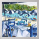 From an orignal painting in acrylics, by Yvonne Ayoub, of the blue Taverna chairs, sun loungers and parasols at Kolios Beach, Skiathos, Greece