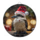 This image captures the festive spirit of the kookaburra in a Santa hat, adding a touch of holiday joy against a bokeh-lit background.