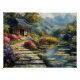 This painting depicts a serene and idyllic garden scene, rich with vibrant colours and intricate details. A traditional Korean pavilion, with its gracefully curved roof and ornate wooden structure, serves as the centerpiece. The pavilion is surrounded by a lush and meticulously maintained garden, bursting with vibrant flowers in shades of pink, purple, orange, and white.