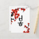 decorative watercolor artwork featuring the korean word for spring in hangul as a korean calligraphy with lots of orange coloured blossoms growing from tree branches on a postcard.