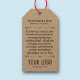 Easily personalise these custom retail hang tags with your own company logo and product information. You can customise them for product hang tags, price tags, warranty tags, gift tags, or favour tags. Available in brown kraft or white matte with a choice of twine string colours. Low minimum order quantity and no setup fee. Made in USA.