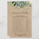 This kraft foliage "mummy or daddy" game is perfect for a rustic baby shower. The front of the game card features "mummy or daddy?", and the back of the card features "baby word scramble". The design features a frame of green leaves and leafy greenery botanicals on a faux kraft paper background. Personalise the front of the card with the name of the mum-to-be and baby shower date. You can personalise the game questions by clicking the "customise" button.