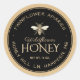 This honey label is fully editable. Personalise with your apiary name, location, type of honey and honey net weight. Common honey net weight conversions: 8oz (227g), 12oz (340g), 16oz (454g), 32oz (907g), 5lb (2.27kg). Black circle on a kraft background and brown text. Honey bee illustration is a vintage design.