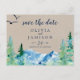 This kraft Rocky Mountain destination save the date postcard is perfect for an outdoor wedding. The design features a blue and green painted wilderness landscape with watercolor pine trees, birds and mountains on a faux light kraft paper background.