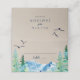 This kraft Rocky Mountain destination wedding place card is perfect for an outdoor wedding reception. The design features a blue and green painted wilderness landscape with watercolor pine trees, birds and mountains on a faux light kraft paper background. Personalise the back of the place cards with the names of the bride and groom and the date. Purchase in bulk and hand write the guest names and table numbers on the printed cards when they arrive.