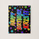 This lively, fun, birthday-themed jigsaw puzzle design features the message "HAPPY BIRTHDAY, KRISTI" with the characters having a colourful rainbow spectrum inspired gradient pattern, along with a vibrant star shapes background pattern. A colourful puzzle like this might be a fun way to send birthday wishes to somebody named Kristi. [~Z0000468]