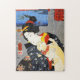 Kuniyoshi Woman with a Cat puzzle. Ukiyo-e from Edo Period Japan. Utagawa Kuniyoshi frequently featured cats in his ukiyo-e woodblock printings. Woman with a cat features a Japanese woman in traditional nineteenth-century Edo period dress holding a big white and cream coloured cat. Behind her stands a painting of a fisherman battling a giant octopus on the ocean and two red emblems featuring Japanese kanji. A pretty gift for fans of Utagawa Kuniyoshi, Japanese art, and cat paintings.