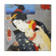 Kuniyoshi Woman with a Cat tile. Ukiyo-e from Edo Period Japan. Utagawa Kuniyoshi frequently featured cats in his ukiyo-e woodblock printings. Woman with a cat features a Japanese woman in traditional nineteenth-century Edo period dress holding a big white and cream coloured cat. Behind her stands a painting of a fisherman battling a giant octopus on the ocean and two red emblems featuring Japanese kanji. A pretty gift for fans of Utagawa Kuniyoshi, Japanese art, and cat paintings.
