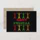 Four dancers in red, blue, green, and yellow dance between the words "Happy Kwanzaa" to help celebrate the sense of community, family, and new beginnings of the coming year.