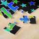 This vibrant and fun birthday-themed jigsaw puzzle design features the message "HAPPY BIRTHDAY, KYLE" with the characters having a colourful rainbow spectrum inspired gradient pattern, in addition to a lively stars background pattern. A colourful puzzle like this might be a fun way to send a birthday greeting message to somebody named Kyle. [~Z0000468]
