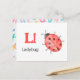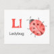 "Letter L is for Ladybug" in our Alphabet Flash Card set. Get all 26 letters of the alphabet! A double-sided postcard that is great for memory games and teaching, geared for education, schools, teachers and homeschoolers for kindergarten and babies. All text is editable if you need to customise.