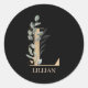 Letter L monogram floral. Letter L in golden brown texture accented with green watercolor compound leaves, flower blossoms and melted gold splashes. Personalised with name in matching font.
