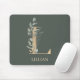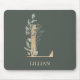 Letter L monogram floral. Letter L in golden brown texture accented with green watercolor compound leaves, flower blossoms and gold dust. Personalised with name in matching font.