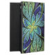 Faux stained glass leaves of green and turquoise frame a central flower in shades of blue and purple.