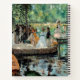 Pierre-Auguste Renoir.  La Grenouillère . lovely landscape on the river in green tones. There are boats on the shore. In the middle ground, a group of people stands on a walkway under a spreading tree. In the background there are yazta and trees. Reproduction of famous works of art  images in the public domain.