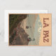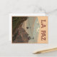 Stylised postcard of La Paz, Bolivia from above, with colourful buildings on steep cliffs and Illimani mountain in background. Muted sunset tones. Text: “La Paz” in block retro sans-serif with zig-zag underline and faux 3D extrude in ochre.