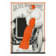A vintage art deco magazine cover from 1922 by Rene Vincent. A woman who is the driver of her stylish car, is dressed in a fur trimmed red coat and hat is adjusting her lipstick whilst resting on the cars mudguard.