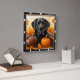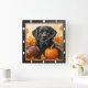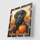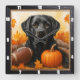 This heartwarming square wall clock features a beautiful black Labrador retriever nestled among vibrant orange and golden autumn leaves. Alongside a classic football and a plump pumpkin, the cosy plaid blanket adds to the warm, inviting fall and Thanksgiving theme, perfect for dog lovers and seasonal decor.
