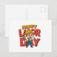 A cheerful cartoon worker in overalls and a hard hat holds tools in front of bold "Happy Labour Day" text.