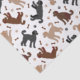 Cute labradoodles in brown, black and tan coats sit, stand and lay with scattered dog bones and paw prints on a white background.