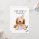 Happy Birthday with a personalised name. A cute Labradoodle puppy dog illustration with a birthday hat and balloons. Add your own message for a personal unique card. Art made with watercolors.
