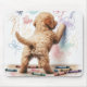 A playful labradoodle puppy appears to be drawing colourful doodles on a wall using crayons scattered on the floor