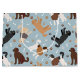 Cute Labradoodle / Goldendoodle dogs sit and stand and rollover with cream, apricot, chocolate, black and parti coats with scattered dog bones and pawprints pattern.