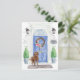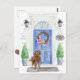 Announce your new address with our stylish announcement featuring a Labradoodle, blue front door, welcome mat, slate sign, topiaries and a floral wreath set on a grey brick background.