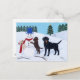 Whimsical Labrador Retriever painting painted by Naomi Ochiai from Japan. Nice for dog lovers who love Labrador Retriever dogs. Yellow Labrador and Chocolate Labrador and Black Labrador are all painted in the picture. Three Labrador dogs are playing with their snowman in the white snow field. Typical Christmas Holiday season scene. You can customise text and more!