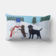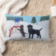 Labrador Christmas with Snowman Lumbar Pillow for Labrador Fans. Three Labrador dogs are playing with their snowman in the white snow field.