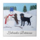 Whimsical Labrador Retriever painting painted by Naomi Ochiai from Japan. Nice for dog lovers who love Labrador Retriever dogs. Yellow Labrador and Chocolate Labrador and Black Labrador are all painted in the picture. Three Labrador dogs are playing with their snowman in the white snow field. Typical Christmas Holiday season scene. You can customise text and more!