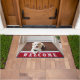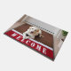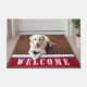 Blonde Labrador Retriever dog on a red and brown mat with welcome text by front door.