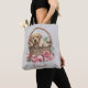 A lightweight tote bag, this design is for the dog lovers. One of the world's most popular dog breeds, this design features a tan Labrador retriever puppy in a basket on blue background. The basket is surrounded by pink flowers. Great for the holidays, birthday, and any special occasion. Order your puppy tote bag today!
