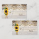 Elegant white lace, ribbon, sunflowers and wood wedding seating place card featuring white lace on brown wood with two crossed satin ribbons and sunflowers. Text in brown. Note that lace, wood and sunflowers are all “printed on” and not real fabric or flowers. This elegant, sophisticated and romantic design with a rustic essence is part of a wedding set and is perfect for a country chic or western fall/autumn wedding with a neutral colour palette.